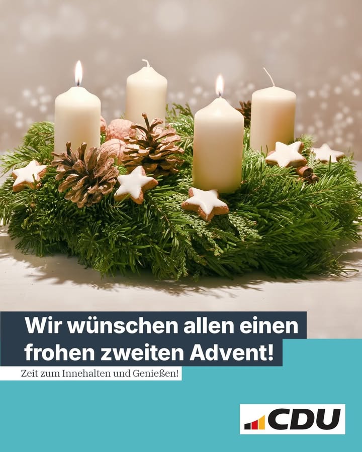 ✨ Einen schönen 2. Advent! ✨Die CDU Darß wünscht allen Bürgern einen lichtvollen und warmen Adventssonntag.Mit der zweiten Kerze wird es ein Stück heller ? ein schönes Symbol für Hoffnung, Gemeinschaft und Zusammenhalt auf unserem Darß. Möge dieser Tag Ruhe schenken und Freude in die Häuser bringen.Wir wünschen allen einen besinnlichen 2. Advent. 🕯️🕯️🌲#2Advent #Adventszeit #Darß #Weihnachtszeit #CDUDarß